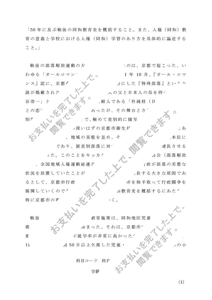 合格済み:A 「50年に及ぶ戦後の同和教育史を概括すること。また、人権(同和)教育の意義と学校における人権(同和)学習のあり方を具体的に論述すること。」