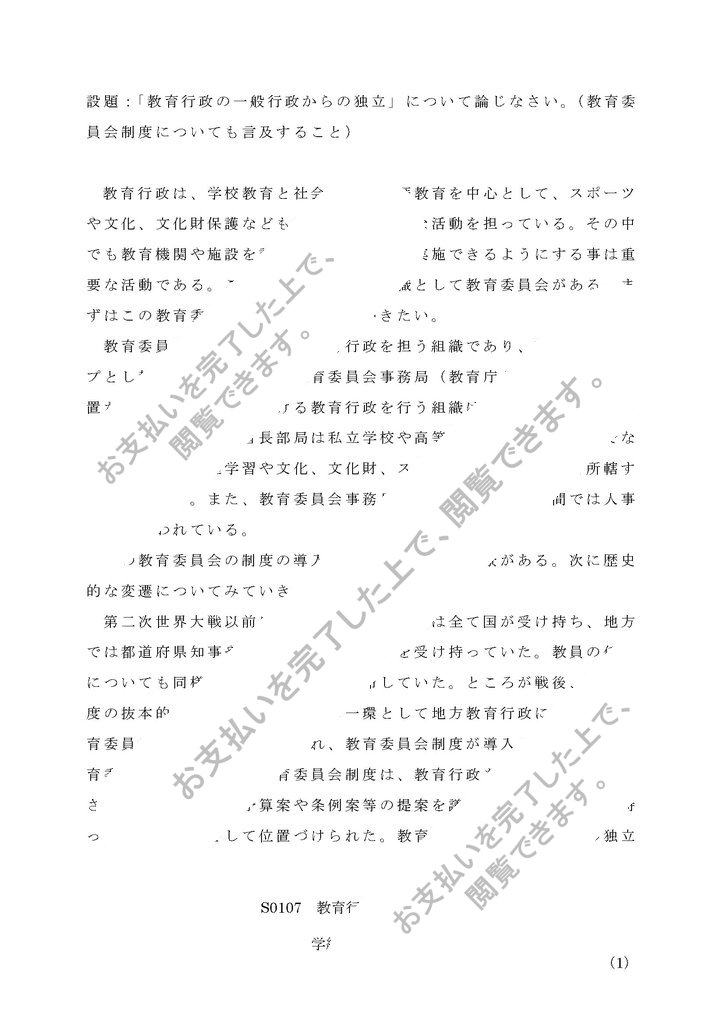 設題:「教育行政の一般行政からの独立」について論じなさい。(教育委員会制度についても言及すること)