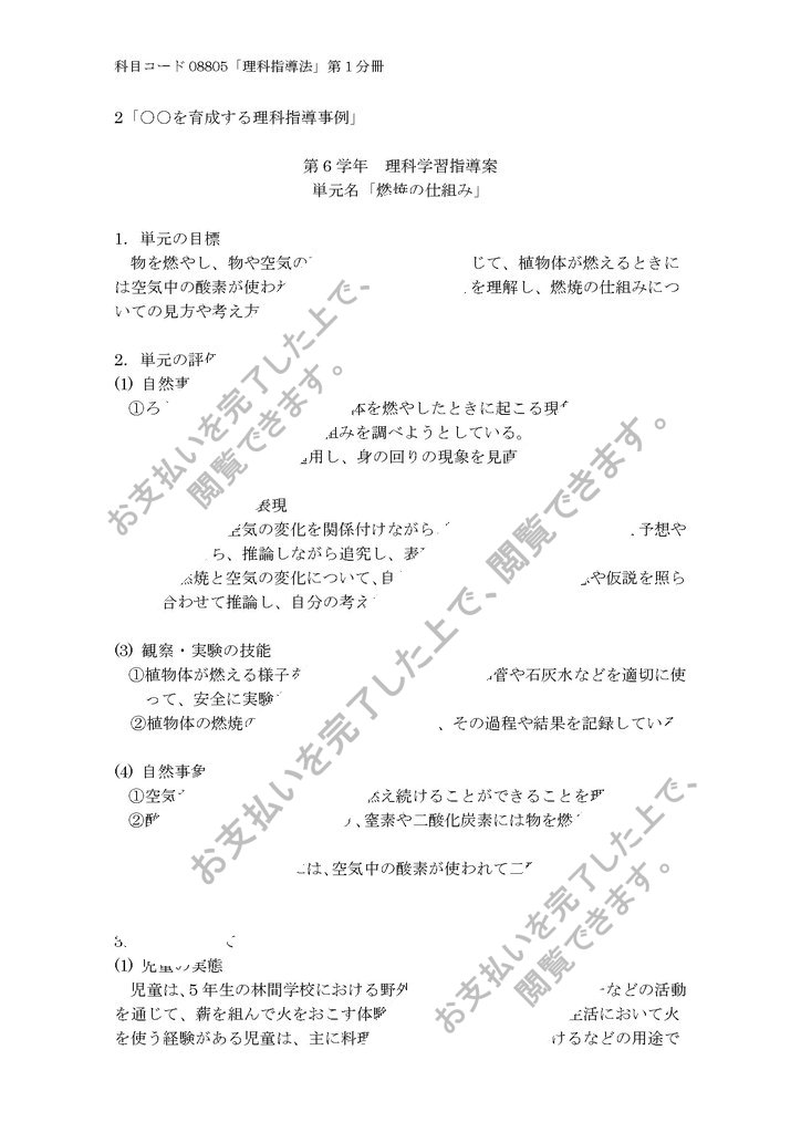 物を燃やし、物や空気の変化を調べる実験を通じて、植物体が燃えるときには空気中の酸素が使われ二酸化炭素ができることを理解し、燃焼の仕組みについての見方や考え方をもつようにする。