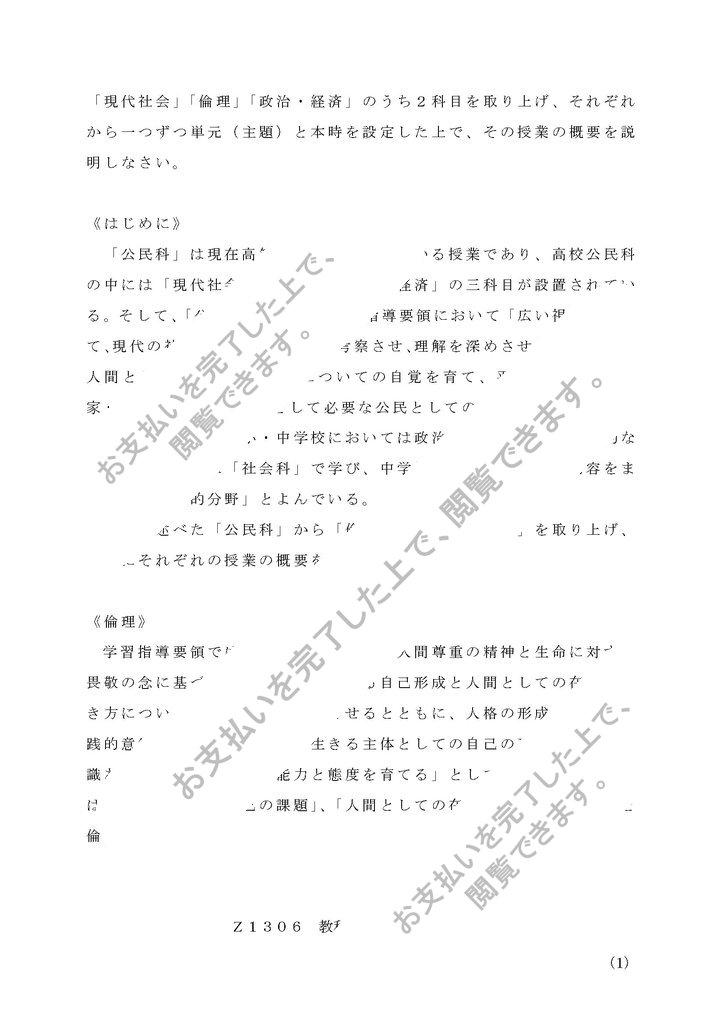 「現代社会」「倫理」「政治・経済」のうち2科目を取り上げ、それぞれから一つずつ単元(主題)と本時を設定した上で、その授業の概要を説明しなさい。