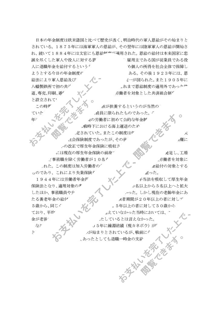 日本の年金制度は欧米諸国と比べて歴史が浅く、明治時代の軍人恩給がその始まりとされている。1875年には海軍軍人の恩給が、その翌年には陸軍軍人の恩給が開始され、続いて1884年には文官にも恩給制度が適用された。恩給の給付は本来国家に忠誠を尽くした軍人や役人に対する恩賞という意味で、雇用主である国が従業員である役人に退職年金を給付するというものであった。そのため個人の所得を社会全体で保障しようとする今日の年金制度の仕組みとは異なるものである。その後1923年には、恩給法により軍人恩給及び文官恩給の給付額の水準の統一が図られた。また1905年に八幡製鉄所で初の共済組合制度が設立されると、これまで恩給...