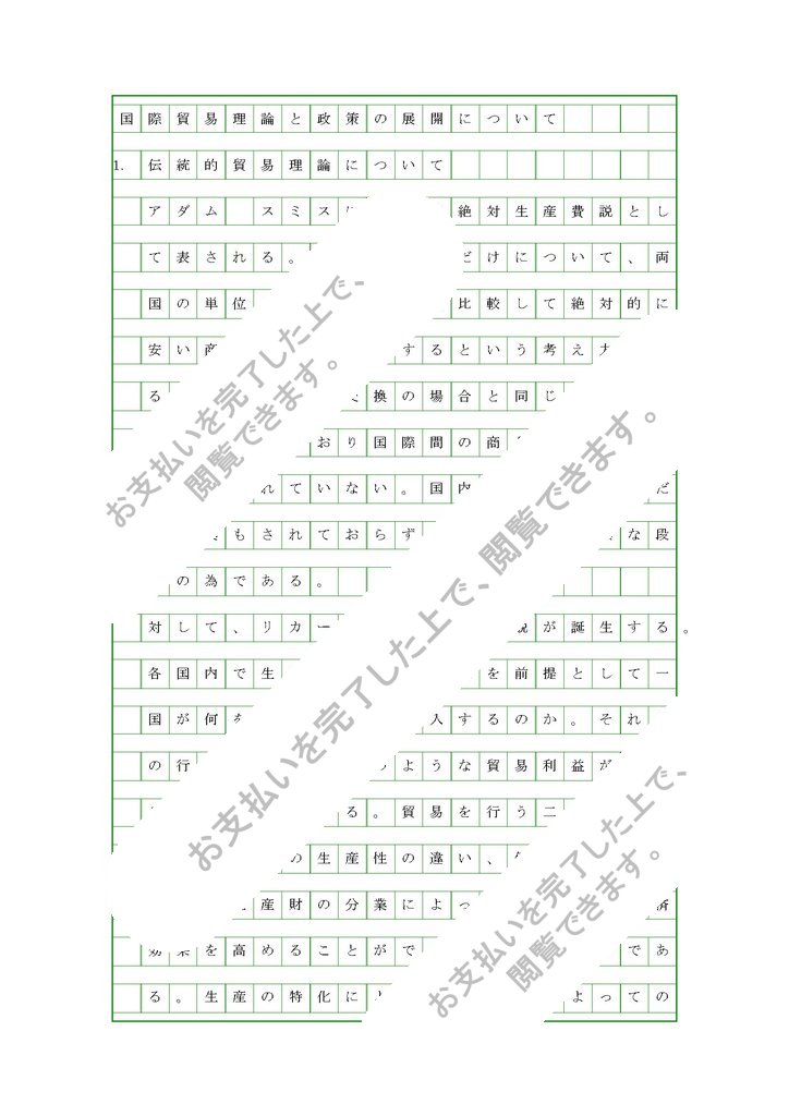 こちらを選択したレポートです②国際貿易理論と政策の展開について整理し、自由貿易主義に関する自身の考えを述べよ。丸写しにせず参考程度にご覧ください。