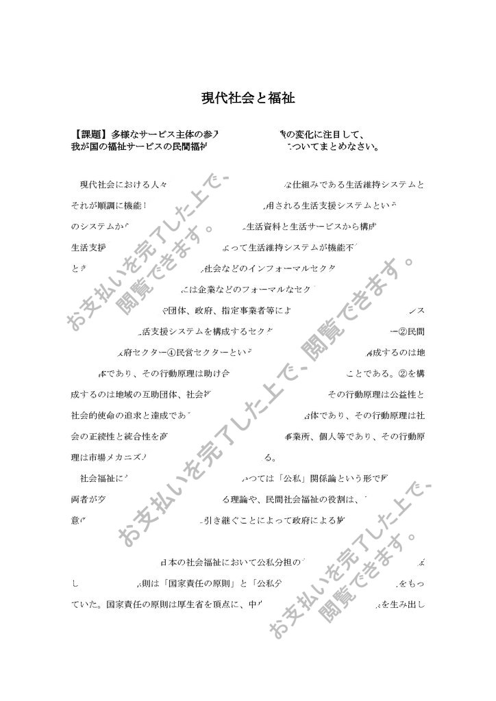 【課題】多様なサービス主体の参入による福祉構造の変化に注目して、 我が国の福祉サービスの民間福祉活動の果たす役割についてまとめなさい。