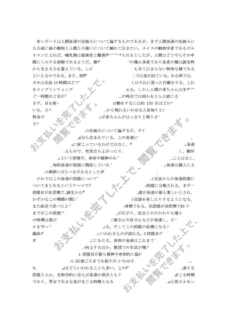 本レポートは人間発達の仕組みについて論ずるものであるが、まず人間発達の仕組みに入る前に他の動物と人間との違いについて触れておきたい。スイスの動物学者であるポルトマンによれば、哺乳類は留巣性と離巣性に分けられるとしたが、人間はどうやらその中間にくみする部類であるようだ。簡単に言えば、前者の種は多産であり後者の種は誕生時から生きる力を蓄えている。しかし人間はこのどちらにも当てはまらない特殊な種であるといえるのである。また、初期経験でも人間と他の動物とでは差が出ている。ある例では、カモは生後16時間ほどで動く大きな対象をとらえ、多くはそれに習った行動をする。これをインプリンティングと呼び、この時期が臨界期である。しかし人間の赤ちゃんは生後すぐ一時間ほど目が覚める瞬間があるというが、この時点では何かをとらえ感じることはできず、目を使って周りの情報を得ようという行動をするには約130日ほどかかるとされている。さらには生後6か月を過ぎたころから現れるいわゆる人見知りといった現象は人間特有のものだとされており、このころが赤ちゃんがはっきりと周りを認識しだすころだとされている。