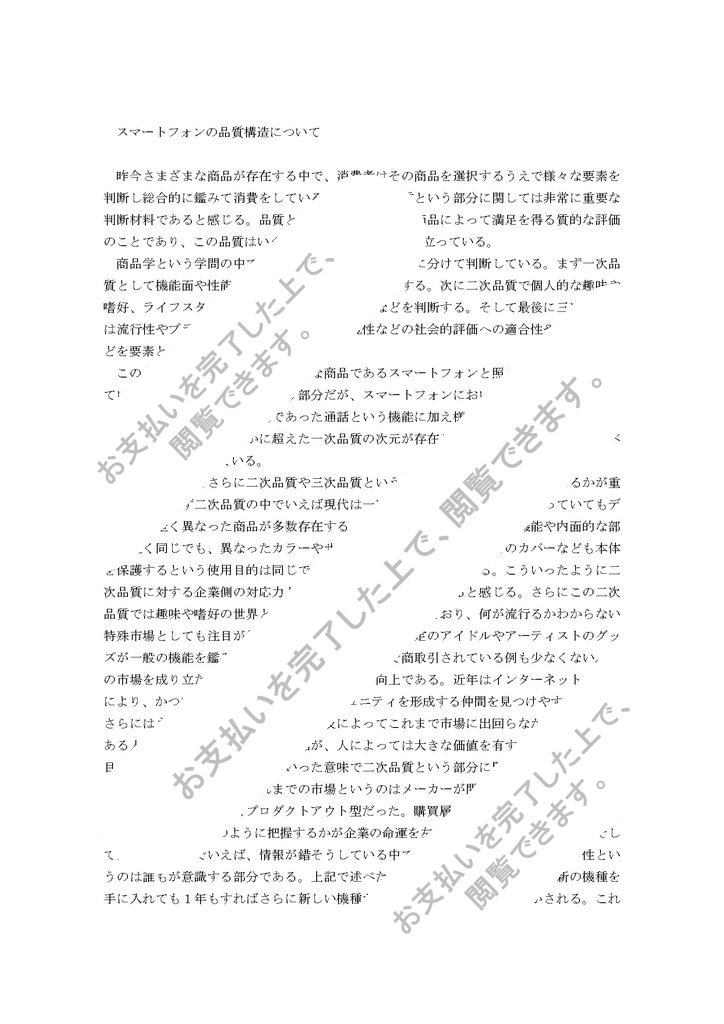 このような品質の要素を現代で的な商品であるスマートフォンと照らし合わせて考察していきたい。まず一次品質という部分だが、スマートフォンにおいてはこの一次品質の向上がすさまじい。本来の目的であった通話という機能に加え様々な機能が付随しており、もはや本来の品質をはるかに超えた一次品質の次元が存在しており、消費者...