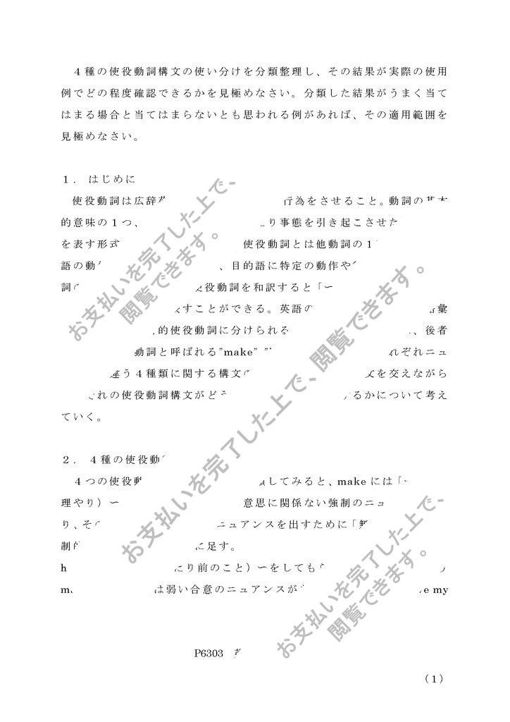 使役動詞は広辞苑によると、「人にある行為をさせること。動詞の基本的意味の1つ、他人に動作を行わせたり事態を引き起こさせたりする意を表す形式」と定義されており、使役動詞とは他動詞の1種で、特に主語の動作・行為の結果として、目的語に特定の動作や行為を行わせる動詞のことである。英語の使役動詞を和訳すると「〜させる」「〜してもらう」といった意味に表すことができる。英語の使役動詞は一般的に語彙的使役動詞と迂言的使役動詞に分けられるが、このレポートでは、後者の迂言的使役動詞と呼ばれる”make” ”have” ”let” ”get”のそれぞれニュアンスの違う4種類に関する構文の分類整理を行い、例文を交えながらそれぞれの使役動詞構文がどういった適用範囲を有するかについて考えていく。