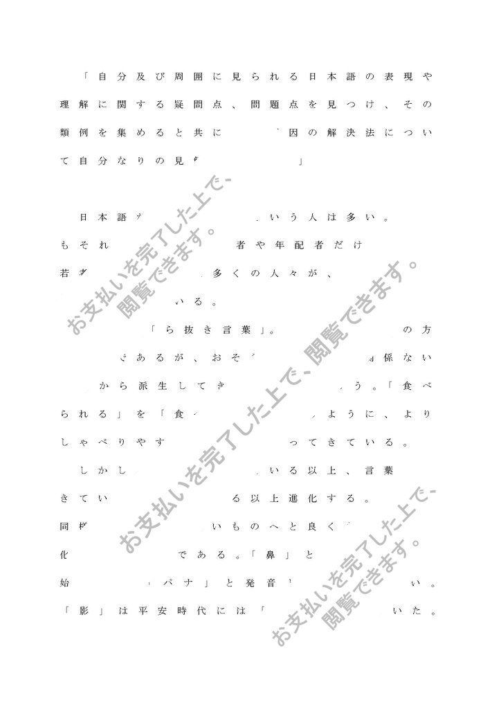「自分及び周囲に見られる日本語の表現や理解に関する疑問点、問題点を見つけ、その類例を集めると共にその原因の解決法について自分なりの見解を述べる。」