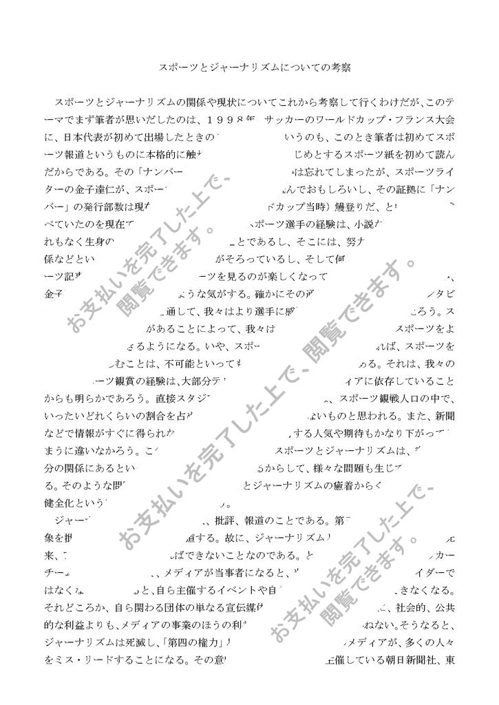 スポーツとジャーナリズムの関係や現状についてこれから考察して行くわけだが、このテーマでまず筆者が思いだしたのは、1998年、サッカーのワールドカップ・フランス大会に、日本代表が初めて出場したときのことである。というのも、このとき筆者は初めてスポーツ報道というものに本格的に触れ、「ナンバー」をはじめとするスポーツ紙を初めて読んだからである。その「ナンバー」の中でだったかどうかは忘れてしまったが、スポーツライターの金子達仁が、スポーツをテーマにした文章は読んでおもしろいし、その証拠に「ナンバー」の発行部数は現在(つまりフランスワールドカップ当時)鰻登りだ、ということを述べていたのを現在でもはっきり覚えている。スポーツ選手の経験は、小説などと違ってまぎれもなく生身の人間が経験した、現実のことであるし、そこには、努力、挫折、夢、人間関係などといった、興味深いファクターがそろっているし、そして何よりも、そのようなスポーツ記事を読むことで、よりスポーツを見るのが楽しくなって、効果が二倍だというのが、金子達仁がいっていたことのような気がする。確かにその通りだと...
