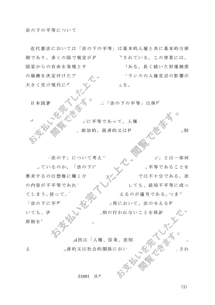 ここで「法の下」について考えてみたい。この「法の下」とは一体何を指しているのか。「法の下に」は法の適用において平等であることを要求するのは想像に難くない。しかし、それだけでは不十分である。法の内容が不平等であれば平等に適用されたとしても、結局不平等に成ってしまう。従って、法の内容にも及ぶと考えるのが適当である。つまり、「法の下に平等」とは、全ての国家作用において、法の与える利益についても、法の不利益についても差別の行われないことを保証する一般的原則を明らかにしたのである...