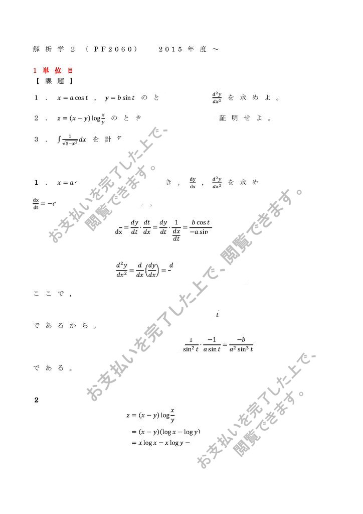 1.x=a cost , y=b sint のとき,dy/dx , (d^2 y)/〖dx〗^2 を求めよ。