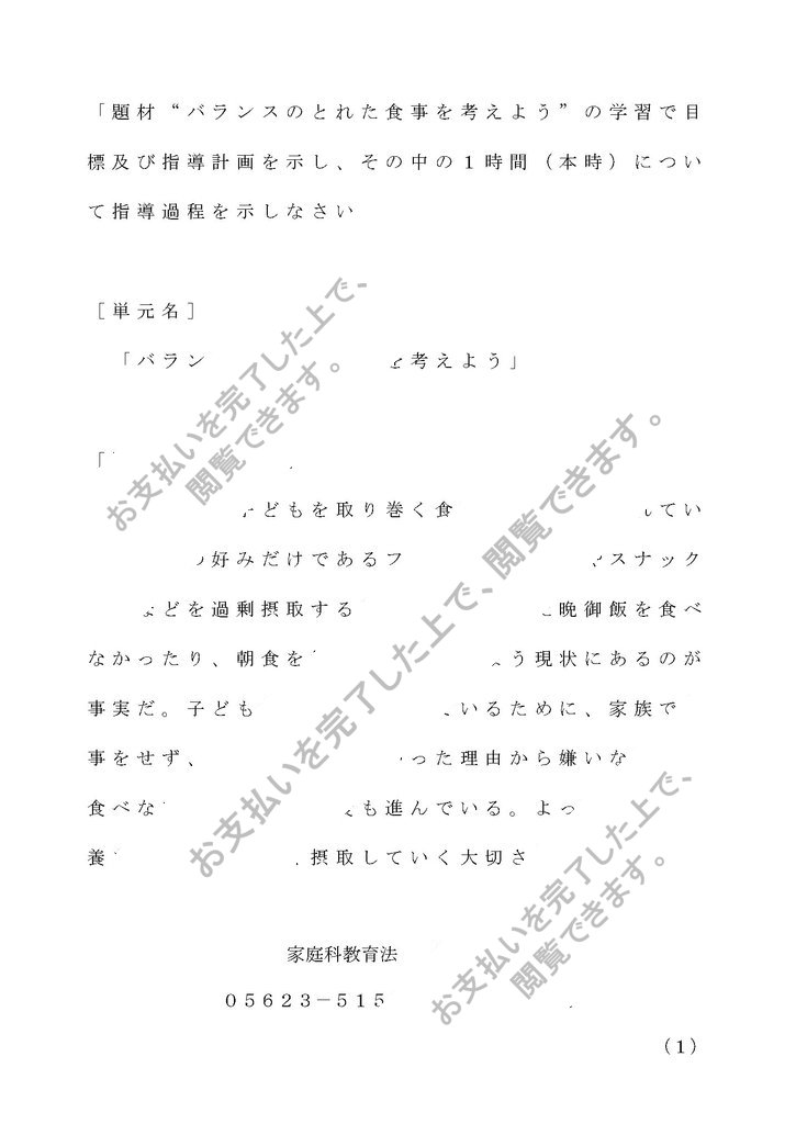 「題材“バランスのとれた食事を考えよう”の学習で目標及び指導計画を示し、その中の1時間(本時)について指導過程を示しなさい。」