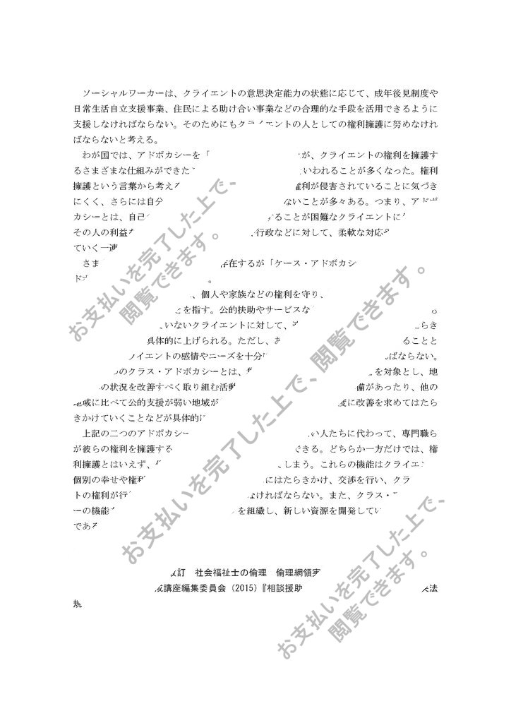 わが国では、アドボカシーを「代弁」と訳されてきたが、クライエントの権利を擁護するさまざまな仕組みができたことに伴い、「権利擁護」といわれることが多くなった。権利擁護という言葉から考えると、クライエントは自分の権利が侵害されていることに気づきにくく、さらには自分の権利を主張することができないことが多々ある。つまり、アドボカシーとは、自己...