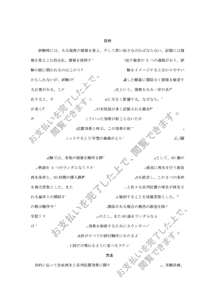 今回の実験では、多数の情報を順序を問わず検索する自由再生法の課題として、60個の二字熟語を4つのランダムなリストに分けた物を用いた。課題提示直後に再生を行う直後再生条件と、...