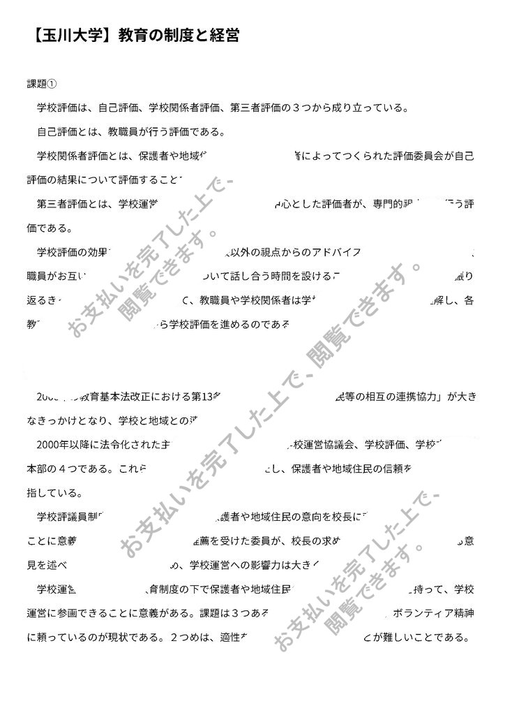 このレポートは、玉川大学通信教育課程・科目「教育の制度と経営」において、合格をいただいたものです。