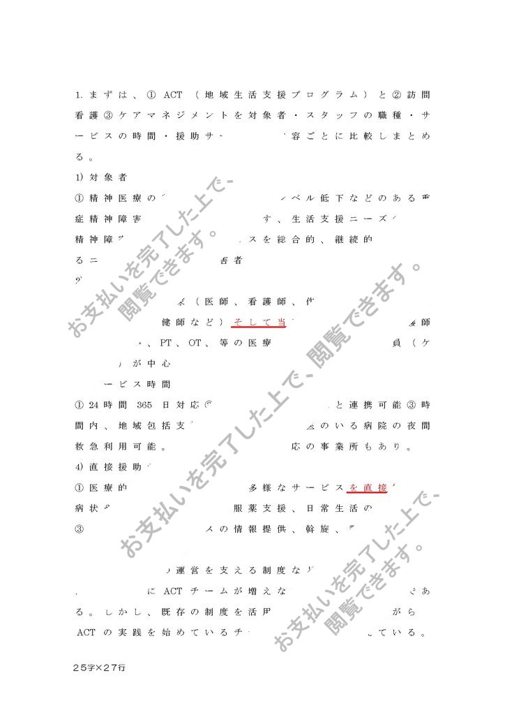 総評:ACTについてのレポートは、もう一つの課題の精神科ディケアについてとは異なり、現実のACT活動に目が触れることがほとんど一般的にはまだない中でよく調べてレポートをまとめあげてあり、とてもまた比較がわかりやすく書かれていました。
