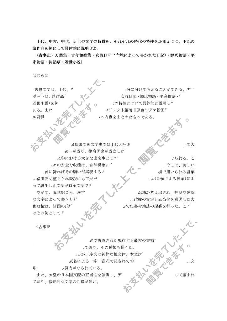 〇第1設題: 上代、中古、中世、近世の文学の特質を、それぞれの時代の特性をふまえつつ、下記の諸作品を例にして具体的に説明せよ。〈古事記・万葉集・古今和歌集・女流日記(女性によって書かれた日記)・源氏物語・平家物語・徒然草・近世小説〉