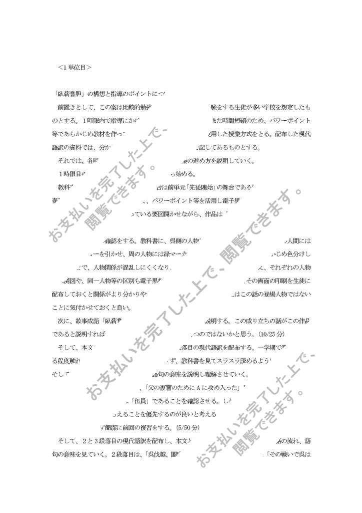 1単位目 テキストPP 72-79の「臥薪嘗胆」について4時限の授業時間を使った単元を構想し、指導のポイントを説明しなさい。なお1限は50分とし、対象者は高等学校1年生で……