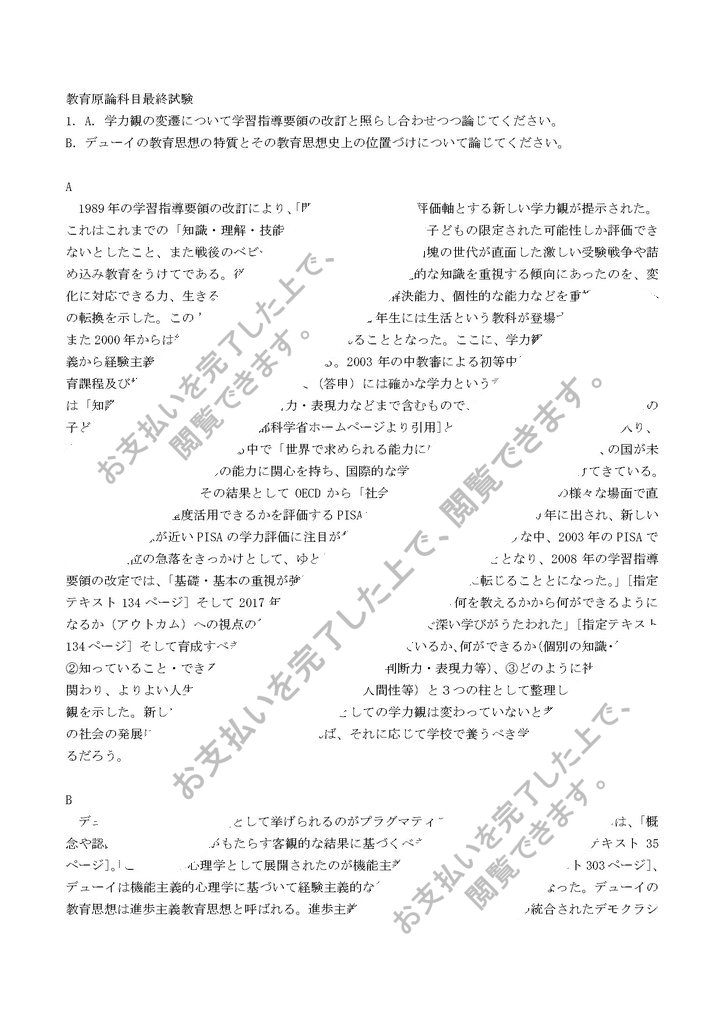 教育原論合格済み科目最終試験答案です。試験対策にお役立てください。