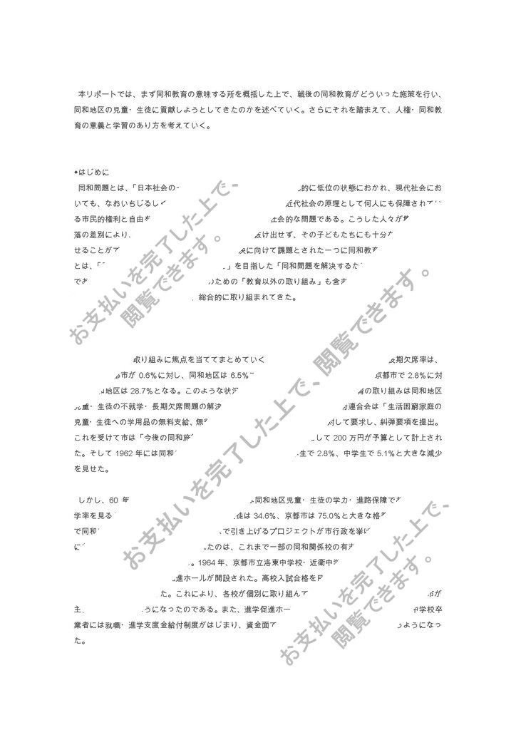 本リポートでは、まず同和教育の意味する所を概括した上で、戦後の同和教育がどういった施策を行い、同和地区の児童・生徒に貢献しようとしてきたのかを述べていく。さらにそれを踏まえて、人権・同和教育の意義と学習のあり方を考えていく。 ◆はじめに 同和問題とは、「日本社会の一部の集団が経済的・社会的・文化的に低位の状態におかれ、現代社会においても、なおいちじるしく基本的人権を侵害され、とくに、近代社会の原理として何人にも保障されている市民的権利と自由を完全に保証されていないという」社会的な問題である。こうした人々が集まった部落の差別により、彼らは雇用・居住の面で貧困から抜け出せず、その子どもたちにも十分な教育を受けさせることができずにいた。そこで同和問題の解決に向けて課題とされた一つに同和教育がある。同和教育とは、「子どもたちの教育権を保障すること」を目指した「同和問題を解決するための教育の営みの総称」である。これにはもちろん、問題解決のための「教育以外の取り組み」も含まれており、互いに密接に関連しながら同和問題解決を目指し、総合的に取り組まれてきた。 ◆戦後の同和教育 今回...