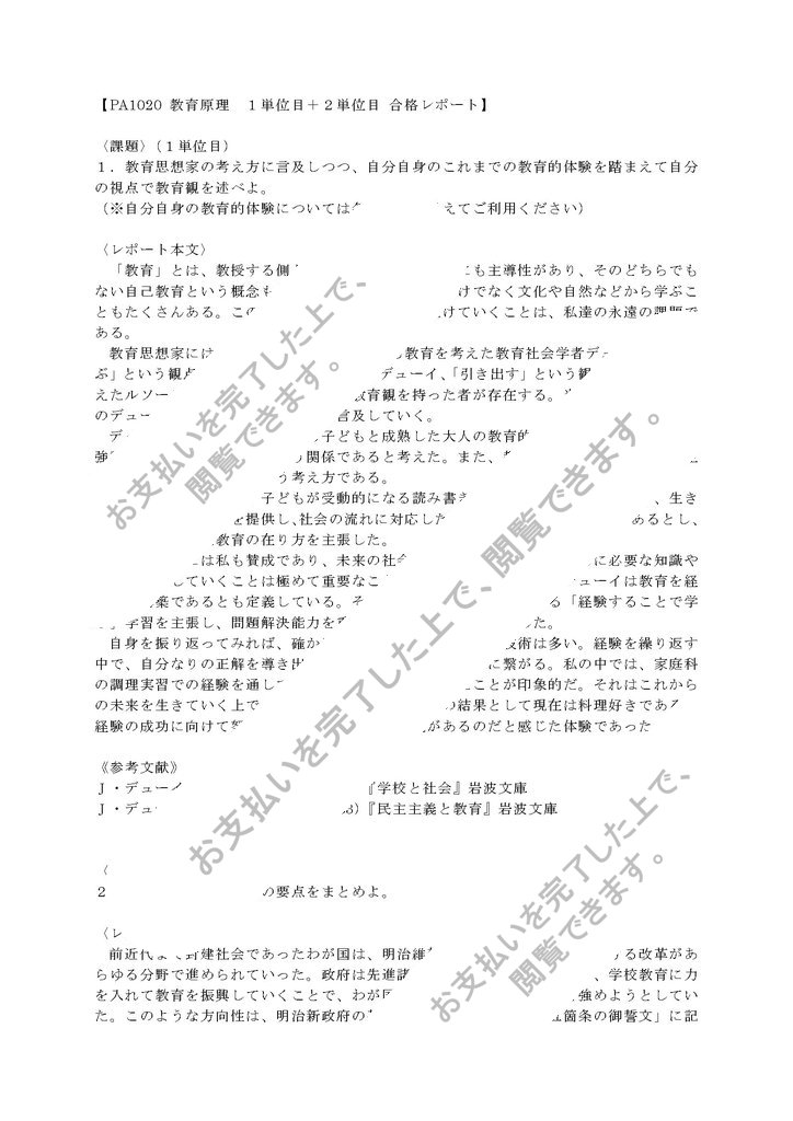 【PA1020 教育原理 1単位目+2単位目 合格レポート】