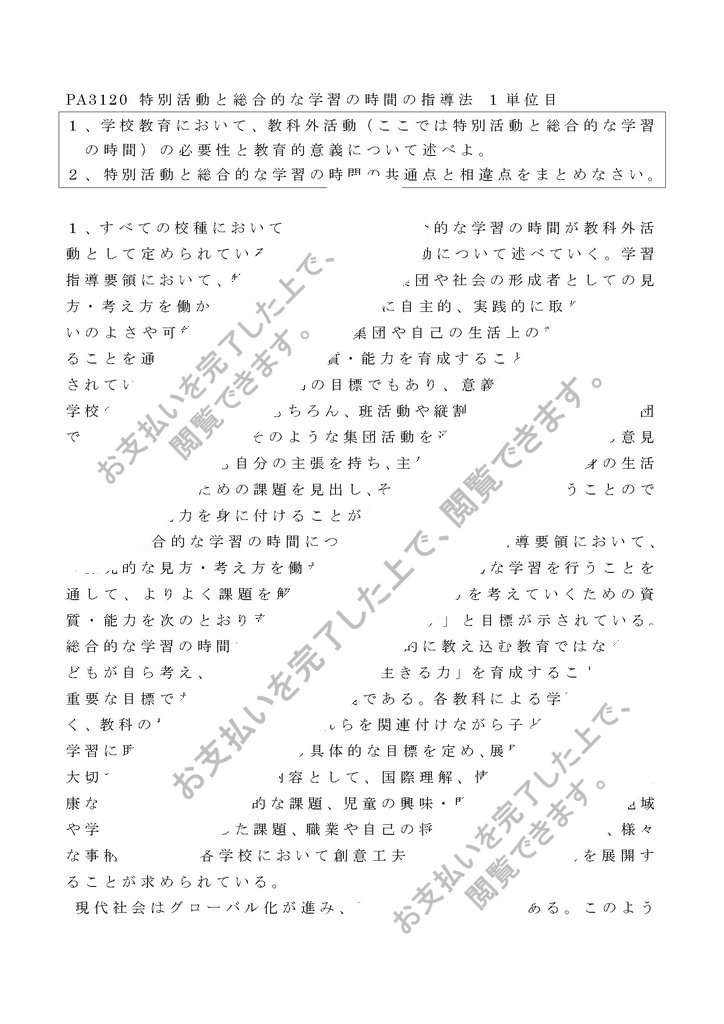 明星大学通信教育部 PA3120 特別活動と総合的な学習の時間の指導法(1単位目)合格レポートです。最後に担当教員からの講評も載せてあります。