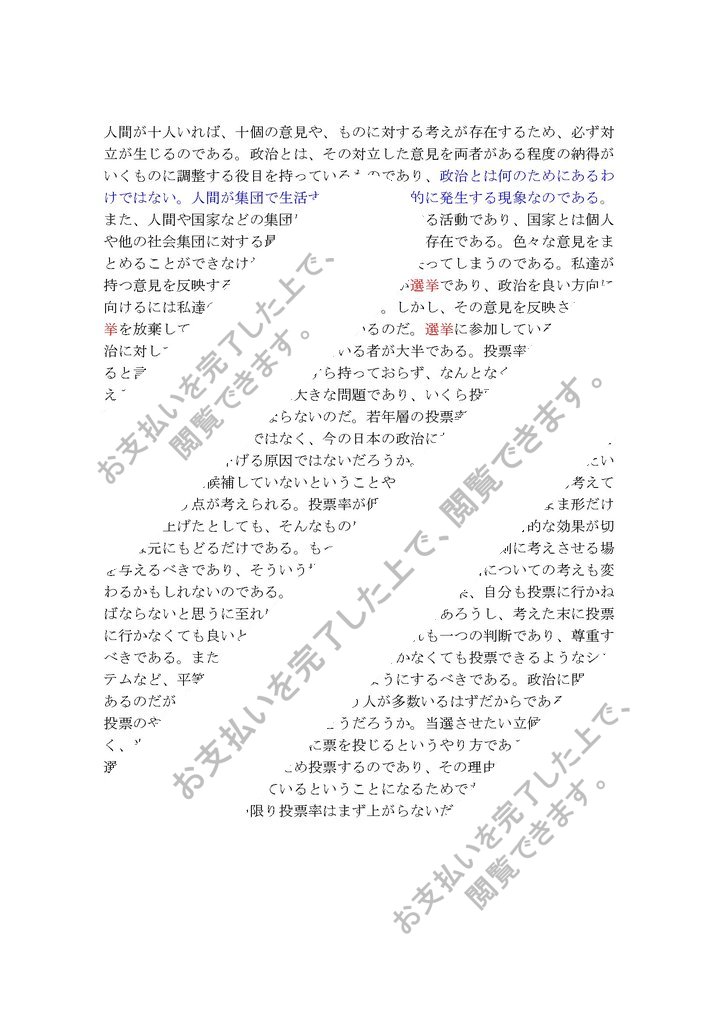 人間が十人いれば、十個の意見や、ものに対する考えが存在するため、必ず対立が生じるのである。政治とは、その対立した意見を両者がある程度の納得がいくものに調整する役目を持っているものであり、政治とは何のためにあるわけではない。人間が集団で生活する場合に必然的に発生する現象なのである。また、人間や国家などの集団における統治に関する活動であり、国家とは個人や他の社会集団に対する最終的な強制力を持った存在である。色々な意見をまとめることができなければ、集団は方向性を見失ってしまうのである。私達が持つ意見を反映することができる方法の一つが選挙であり、政治を良い方向に向けるには私達の意見がとても重要である。...