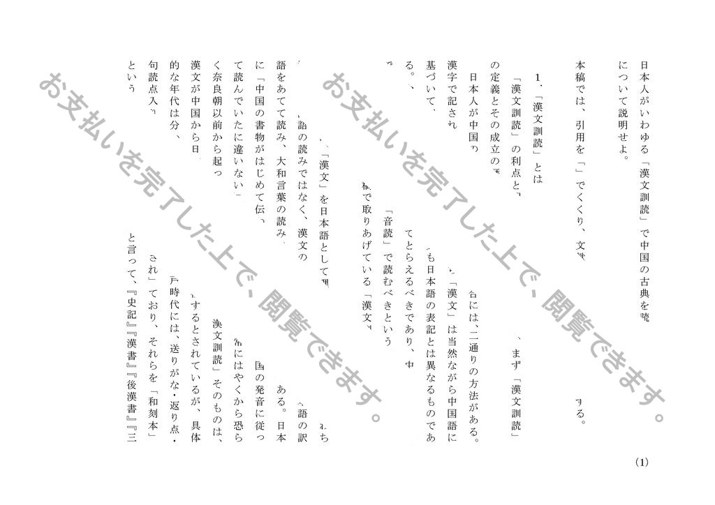 (1) 日 本 人 が い わ ゆ る 「 漢 文 訓 読 」 で 中 国 の 古 典 を 読 む 場 合 の 利 点 と 問 題 点 に つ い て 説 明 せ よ 。 本 稿 で は 、 引 用 を 「 」 で く く り 、 文 献 名 は 『 』 で く く る こ と と す る 。 1 . 「 漢 文 訓 読 」 と は 「 漢 文 訓 読 」 の 利 点 と 問 題 点 を 考 察 す る に あ た り 、 ま ず 「 漢 文 訓 読 」 の 定 義 と そ の 成 立 の 歴 史 に つ い て 論 じ て い く 。 日 本 人 が 中 国 の 古 典 で あ る 漢 文 ...