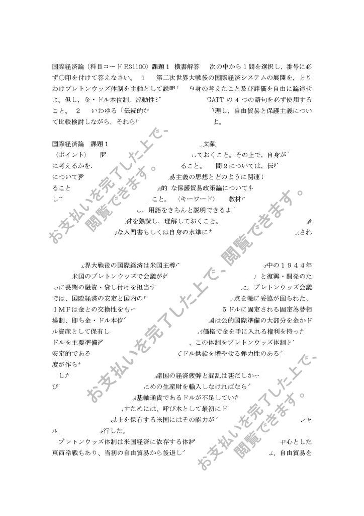 国際経済論(科目コードR31100)課題1 横書解答 次の中から1問を選択し,番号に必ず〇印を付けて答えなさい。 1 第二次世界大戦後の国際経済システムの展開を,とりわけブレトンウッズ体制を主軸として説明し,自身の考えたこと及び評価を自由に論述せよ。但し,金・ドル本位制,流動性ジレンマ,IMF,GATTの4つの語句を必ず使用すること。 2 いわゆる「伝統的な貿易政策」について整理し,自由貿易と保護主義について比較検討しながら,それらに対する自身の考えを述べよ。