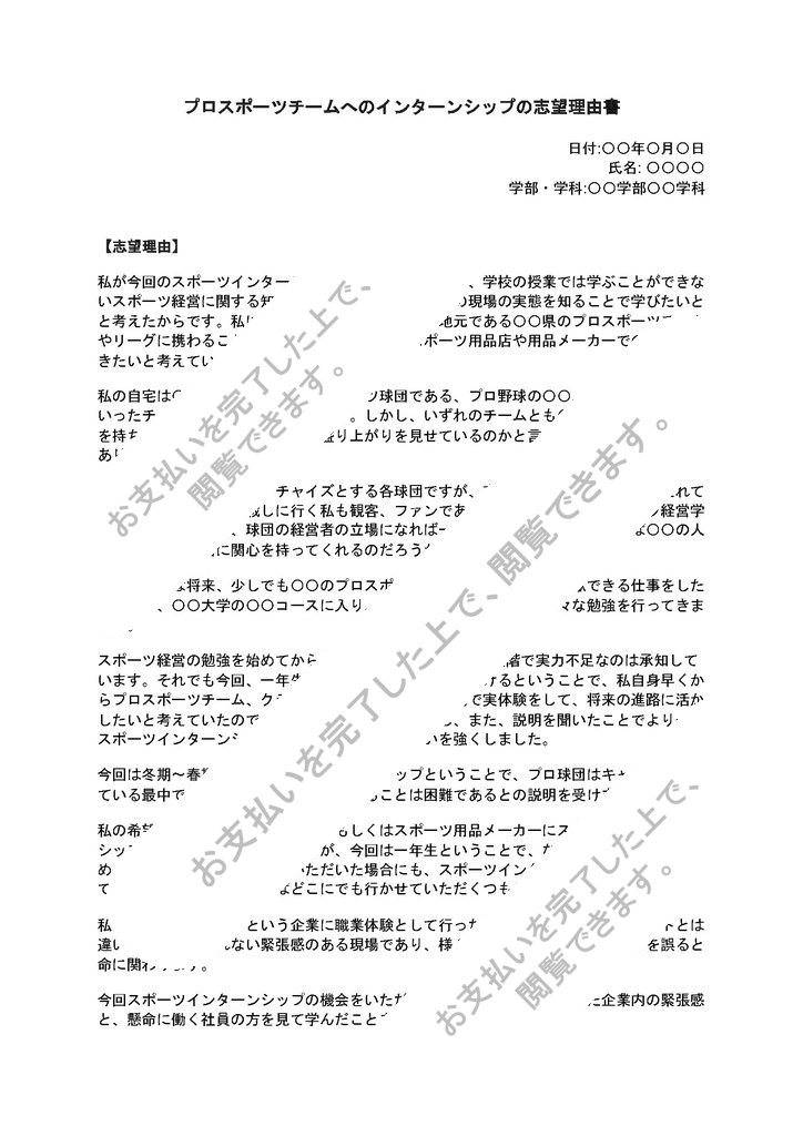大学生あるいは専門学生が「プロスポーツのチームやクラブ」にインターンシップをする場合に提出する志望理由書です。