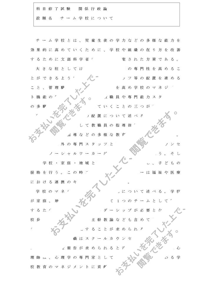 設題:チーム学校について。に関する課題についてまとめました。 評価:A評価をいただきました。参考資料としてご活用ください。