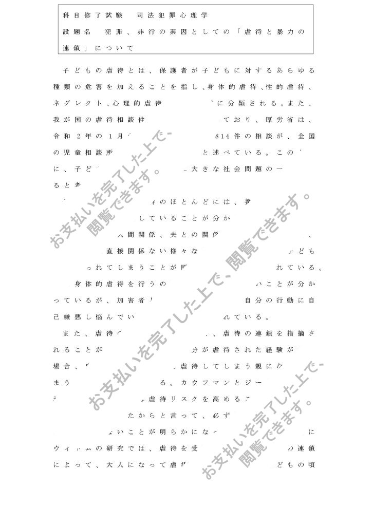 設題:犯罪、非行の素因としての虐待と暴力の連鎖について。に関する課題についてまとめました。 評価:A評価をいただきました。参考資料としてご活用ください。