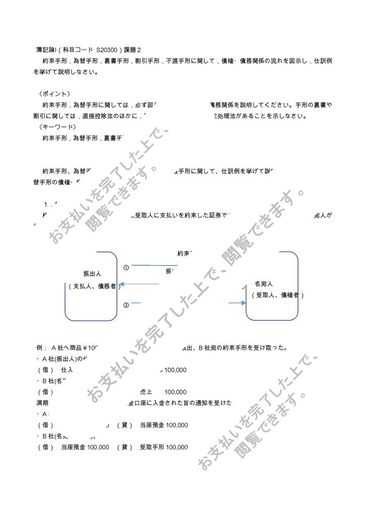 約束手形、為替手形、裏書手形、割引手形、不渡手形に関して、仕訳例を挙げて説明する。約束手形,為替手形の債権・債務関係の図は別紙とする。