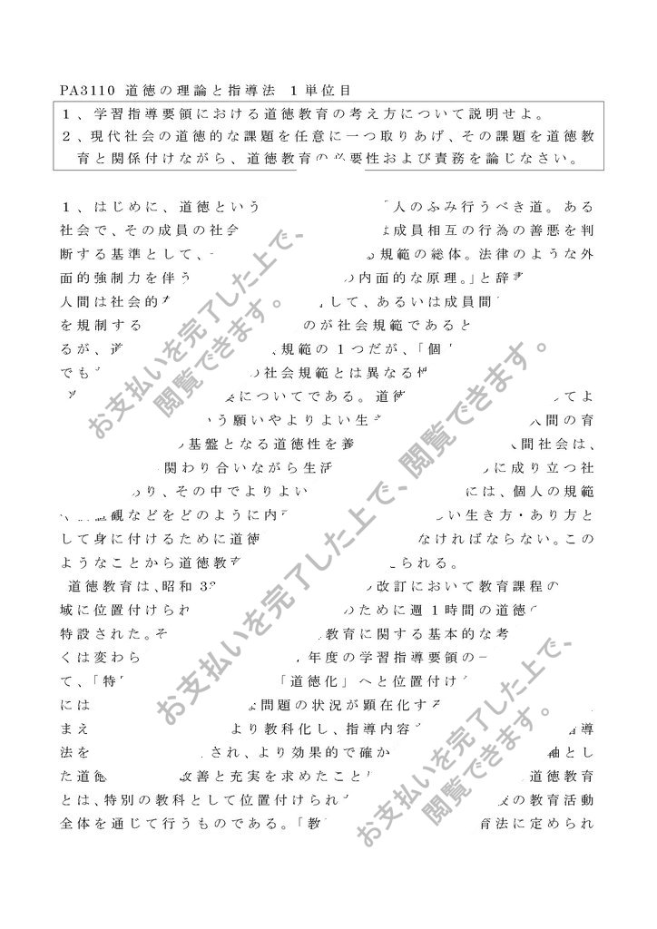 明星大学通信教育部 PA3110 道徳の理論と指導法(1単位目)合格レポートです。最後に、担当教員からの講評も載せてあります。