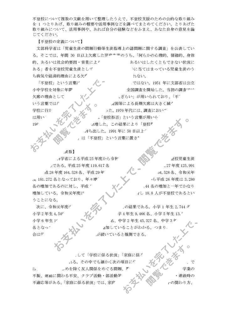不登校について複数の文献を用いて整理したうえで、不登校支援のための公的な取り組みを1つとりあげ、取り組みの概要や活用事例などを調べてまとめてください。とりあげた取り組みについて、活用事例や、あれば自分の経験などをふまえ、あなた自身の意見を論じてください。
