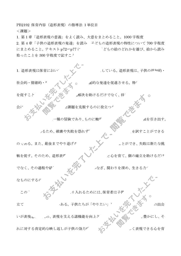 2. 第4章「子供の造形表現の発達」を読み、子どもの造形表現の特性について700字程度にまとめること。テキストp72〜p77に載っている子どもの絵のどれかを選び、絵から読み取ったことを300字程度で記すこと。