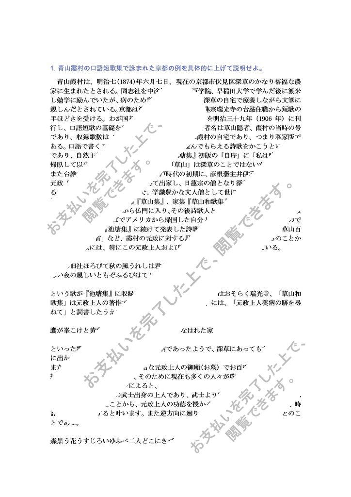 1.青山霞村の口語短歌集で詠まれた京都の例を具体的に上げて説明せよ。