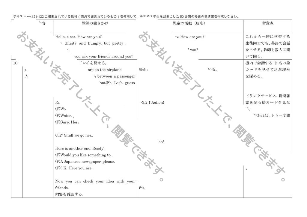テキスト pp.121-122 に掲載されている教材(四角で囲まれているもの)を使用して、中学校 3 年生を対象にした 50 分間の授業の指導案を作成しなさい。