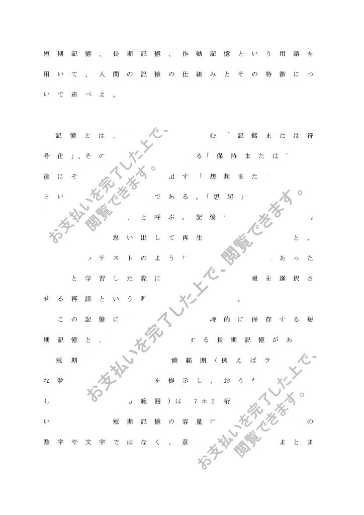 《設題》短期記憶、長期記憶、作動記憶という用語を用いて、人間の記憶の仕組みとその特徴について述べよ。