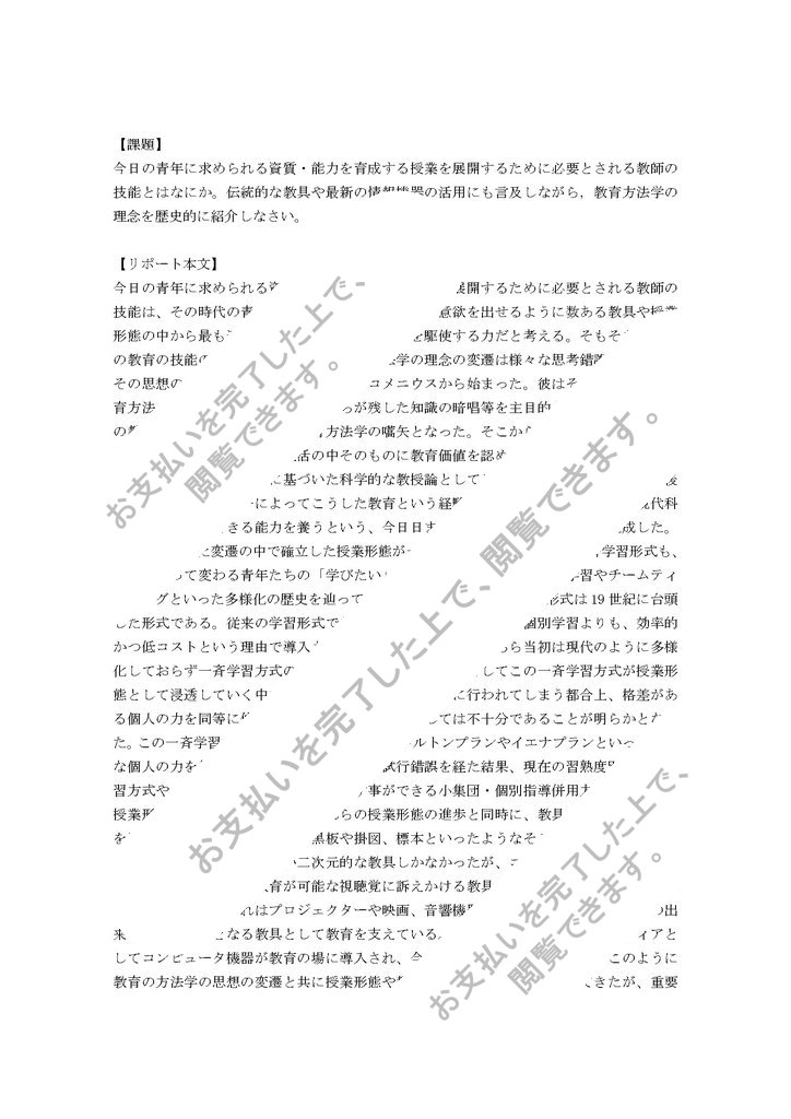 教育の方法・技術論2019~2022年度リポート課題の合格レポートです丸写しはさけて、レポート作成の際の参考資料としてお使いいただけますと幸いです。このご時世で色々と大変だとは思いますが、教員免許取得できるよう一緒に頑張りましょう