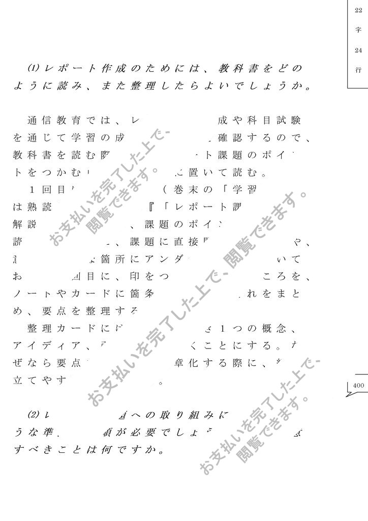 1回目は全体を通読(巻末の「学習指導書」 は熟読)。2回目は『「レポート課題」教材 解説』を先に読み、課題のポイントを絞って 読む。その際に、課題に直接関連する箇所や、 意味の曖昧な箇所にアンダーラインを引いて おく。3回目に、印をつけておいたところを、 ノートやカードに箇条書きにし、それをまと め、要点を整理する。 整理カードには、1枚につき1つの概念、 アイディア、引用のみを書くことにする。な ぜなら要点を論理的に文章化する際に、組み 立てやすいからである。 <400>