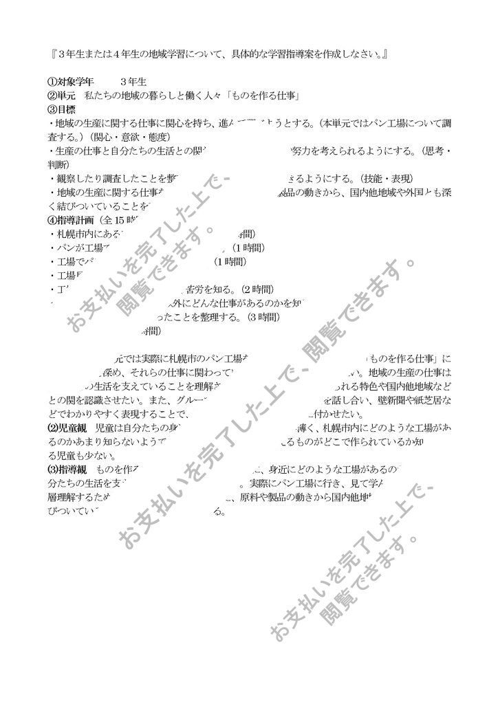 『3年生または4年生の地域習について、具的な習指導案を作成しなさい。』
