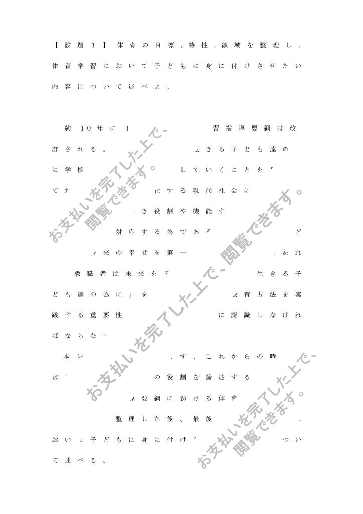 【設題1】 体育の目標,特性,領域を整理し,体育学習において子どもに身に付けさせたい内容について述べよ。