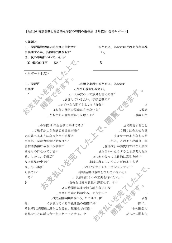 明星大学 通信教育課程【PA3120 特別活動と総合的な学習の時間の指導法 2単位目】の合格レポート(優評価)です。