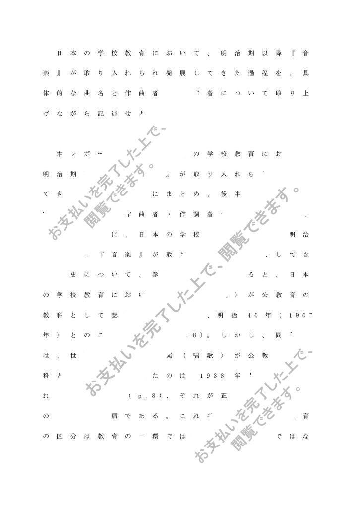 本レポートでは、日本の学校教育において明治期以降に『音楽』が取り入れられ発展してきた歴史を前半にまとめ、後半で具体的な唱歌と、その作曲者・作詞者について考察する。はじめに、日本の学校教育において明治期以降に『音楽』が取り入れられ発展してきた歴史について、参考文献④によると、日本の学校教育において音楽(唱歌)が公教育の教科として認められたのは、明治40年(1907年)とのことである(p.8)。しかし、同著では、世界で初めて音楽(唱歌)が公教育の教科として認められたのは1938年とも記載されているため(p.8)、それが正ならば、同著の記載は矛盾である。これは日本の唱歌教育の区分は教育の一環ではあるが公教育ではないという意味ならば、同著の記載は矛盾ではなくなるが、どちらにせよ、学校教育における音楽教育の起源は諸説あるため、本稿のように日本の音楽教育の歴史に限定して考察する場合であっても、その点は注意が必要である。実際、明治5年(1872年)の学制で音楽は...