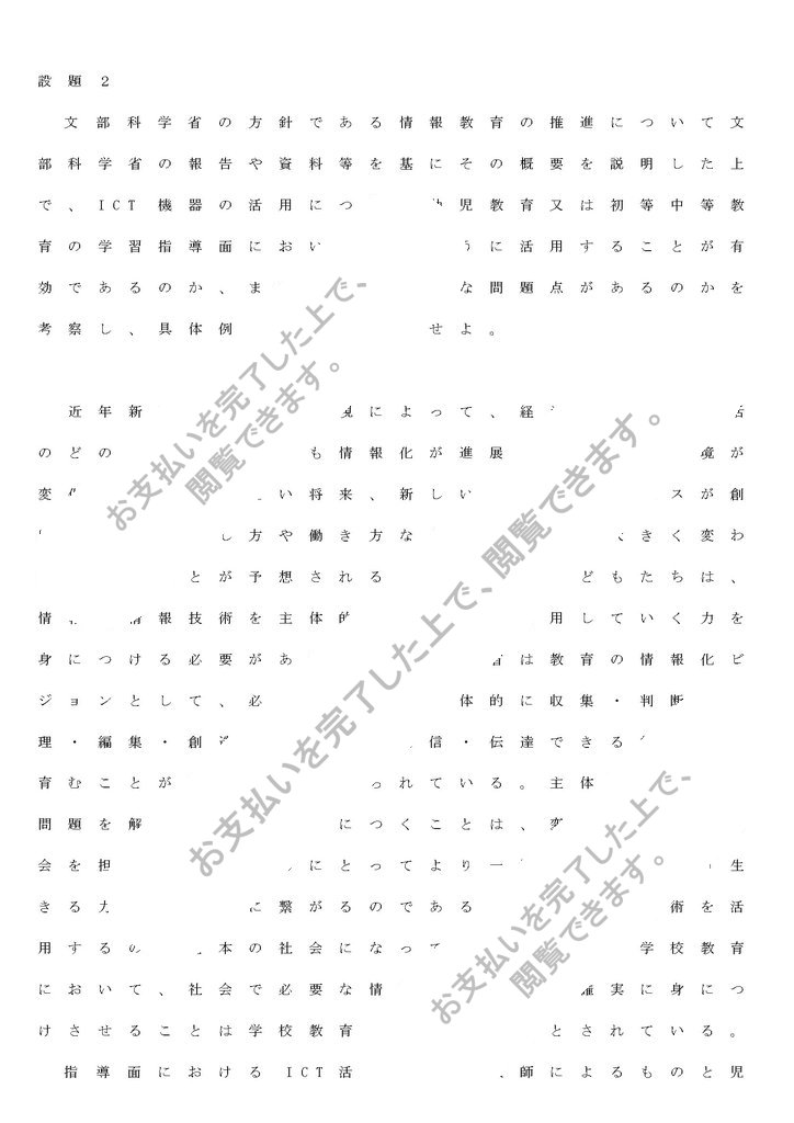 設題2:文部科学省の方針である情報教育の推進について文部科学省の報告や資料等を基にその概要を説明した上で、ICT機器の活用について幼児教育又は初等中等教育の学習指導面においてどのように活用することが有効であるのか、また、どのような問題点があるのかを考察し、具体例を用いて論述せよ。