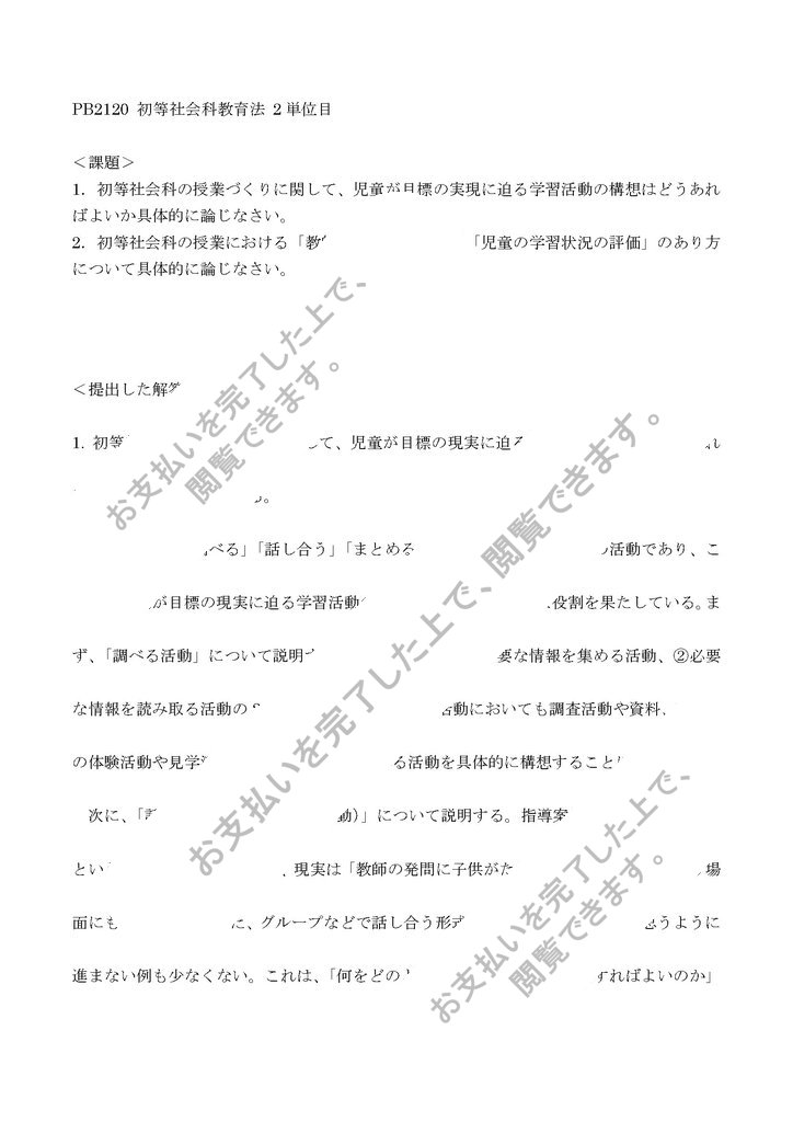 2.初等社会科の授業における「教師の主たる問い」と「児童の学習状況の評価」のあり方について具体的に論じなさい。