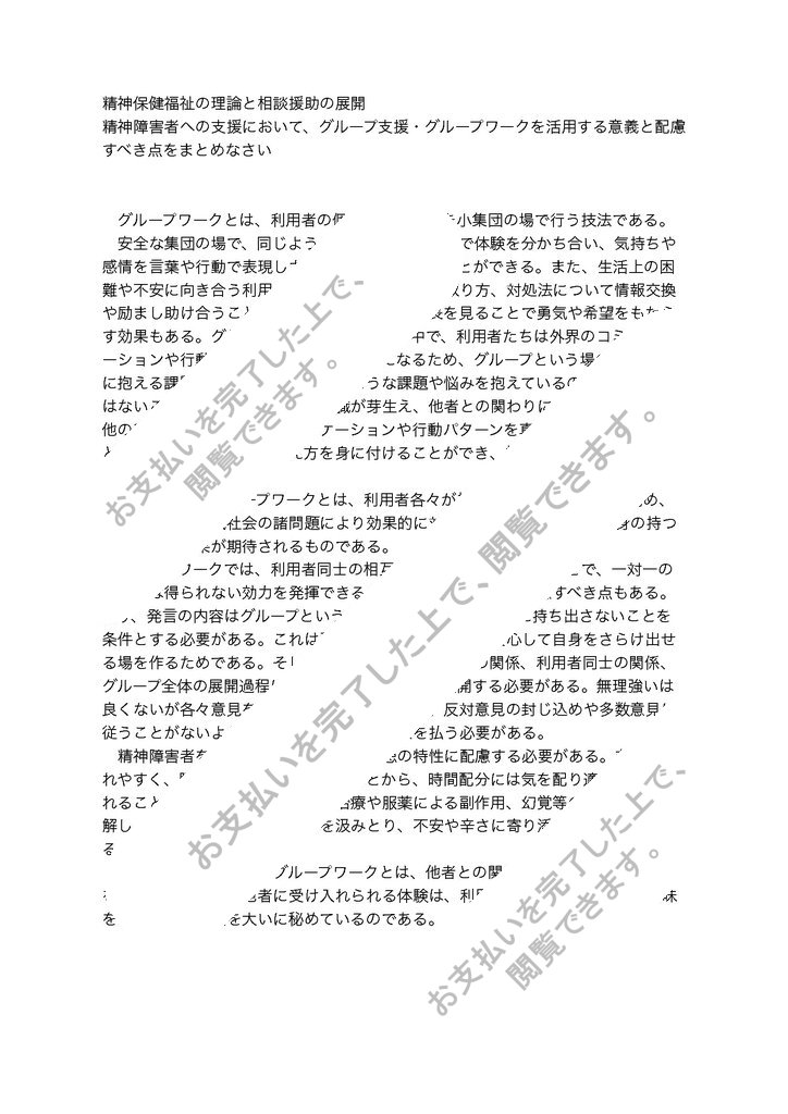 【課 題】精神障害者への支援において、グループ支援・グループワークを活用する意義と配慮すべき点をまとめなさい