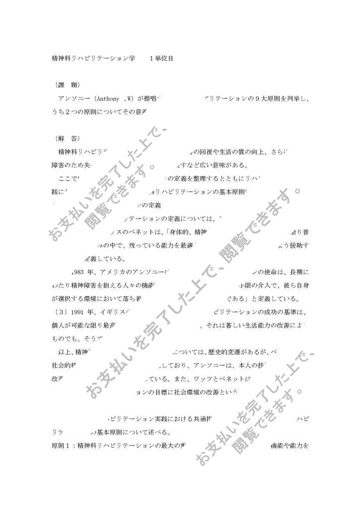 精神科リハビリテーション学の1単位目の合格レポートです。アンソニー(Anthony ,W)が提唱する精神科リハビリテーションの原則とその意義について具体的にまとめられておりレポート作成の参考になると思います。