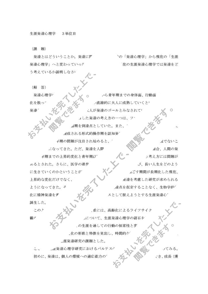 生涯発達心理学の3単位目の合格レポートです。発達に関する心理学が昔の「発達心理学」から現在の「生涯発達心理学」へと変わっていった経緯を踏まえ、現在の生涯発達心理学における発達の考え方についてまとめられておりレポート作成の参考になると思います。