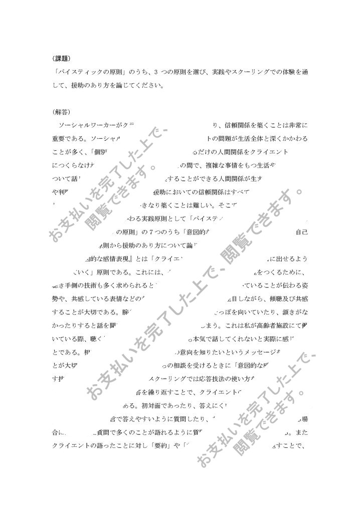 「バイスティックの原則」のうち、3つの原則を選び、実践やスクーリングでの体験を通して、援助のあり方を論じてください。
